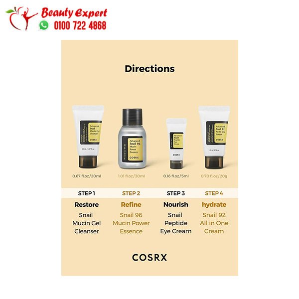 Get your COSRX All About Snail 4-Step Kit now and enjoy deeply hydrated, elastic, and naturally glowing skin. 01007224868 – 01064496005