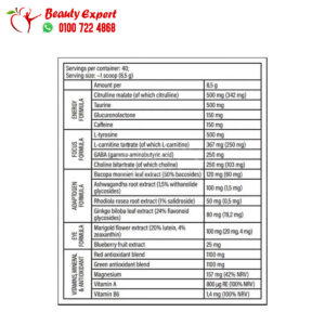 - مستخلص أشواغاندا (ويثانيا سومنيفيرا) 700 ملغ: لتخفيف التعب والإرهاق، ويسهم في الاستمرار في التمرين لمدة أطول، كما يساعد على الاسترخاء والنوم العميق، والتخفيف من الأرق واضطرابات النوم.