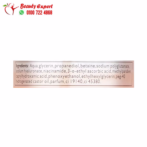- Niacinamide (النياسيناميد / فيتامين B3): يساعد على توحيد لون البشرة، تقليل البقع، وتحسين مرونة الجلد.